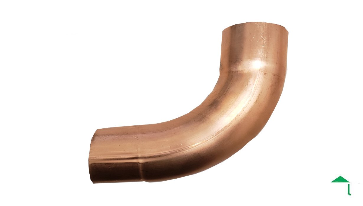 Curva in rame diametro 60 mm a 90°, chiamata anche gomito tubo pluviale in rame.  Chiamata anche curva in rame.  Serve per spostamenti pratici che derivano dal montaggio della grondaia. Se abbiamo bisogno di muovere il tragitto del nostro discendente oppure accostarlo al muro abbiamo bisogno di questo gomito.  Ma non solo!  L’inclinazione di 90° che possiede il nostro gomito o curva pluviale rame, dona una pendenza secca all’acqua che dalla nostra grondaia scende dentro al nostro tubo pluviale, dandogli il tragitto e indirizzando il discendente dove ci è più congeniale.