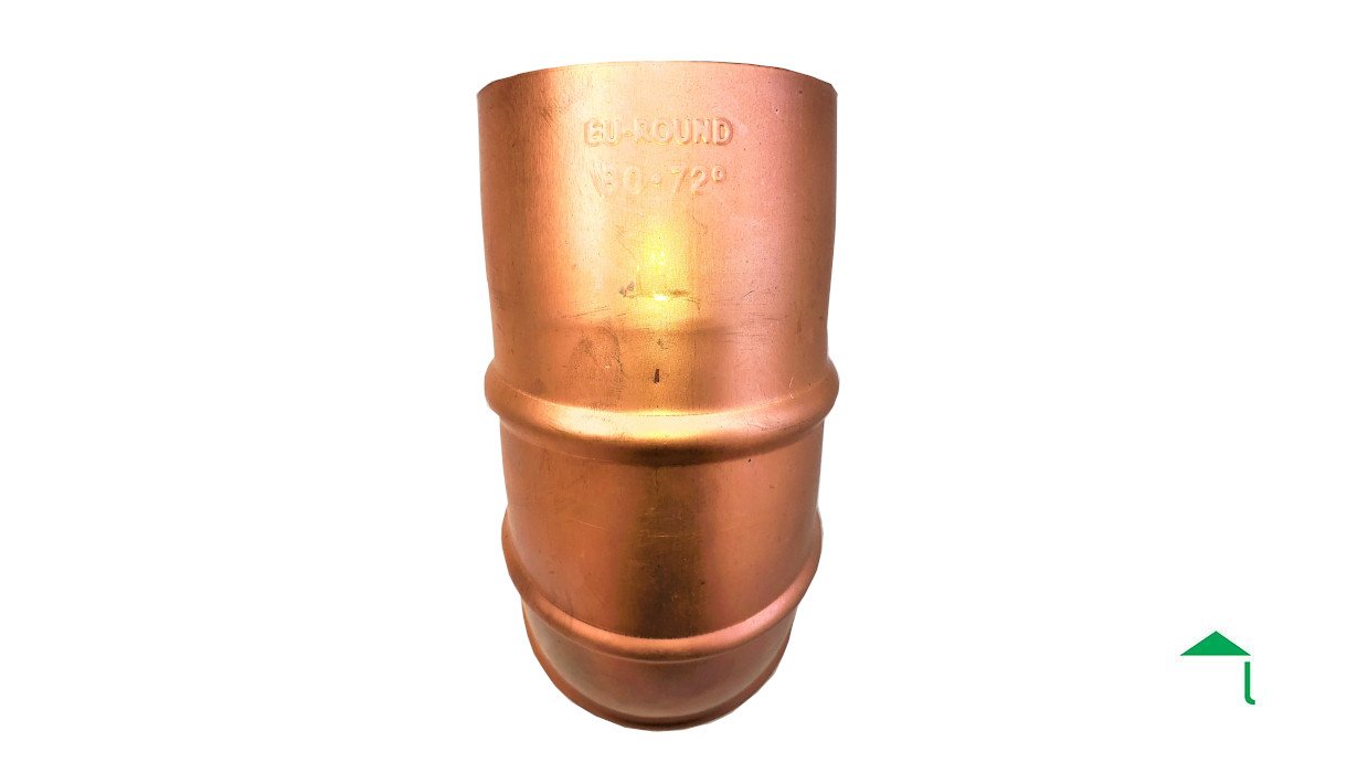 Gomito o curva rame per tubo pluviale in rame diametro 80 a 72°. Chiamata anche torta in rame. Serve per spostamenti pratici che derivano dal montaggio della grondaia. Se abbiamo bisogno di muovere il tragitto del nostro discendente oppure accostarlo al muro abbiamo bisogno di questo gomito. L’inclinazione di 72° che possiede il nostro gomito o curva rame, dona la giusta pendenza all’acqua che dalla nostra grondaia scende dentro al nostro tubo pluviale, dandogli il tragitto e indirizzando il discendente dove ci è più congeniale. Il suo disegno unico a tre cerchi, rende la nostra curva un elemento decorativo in alternativa alla semplice curva per tubo pluviale.