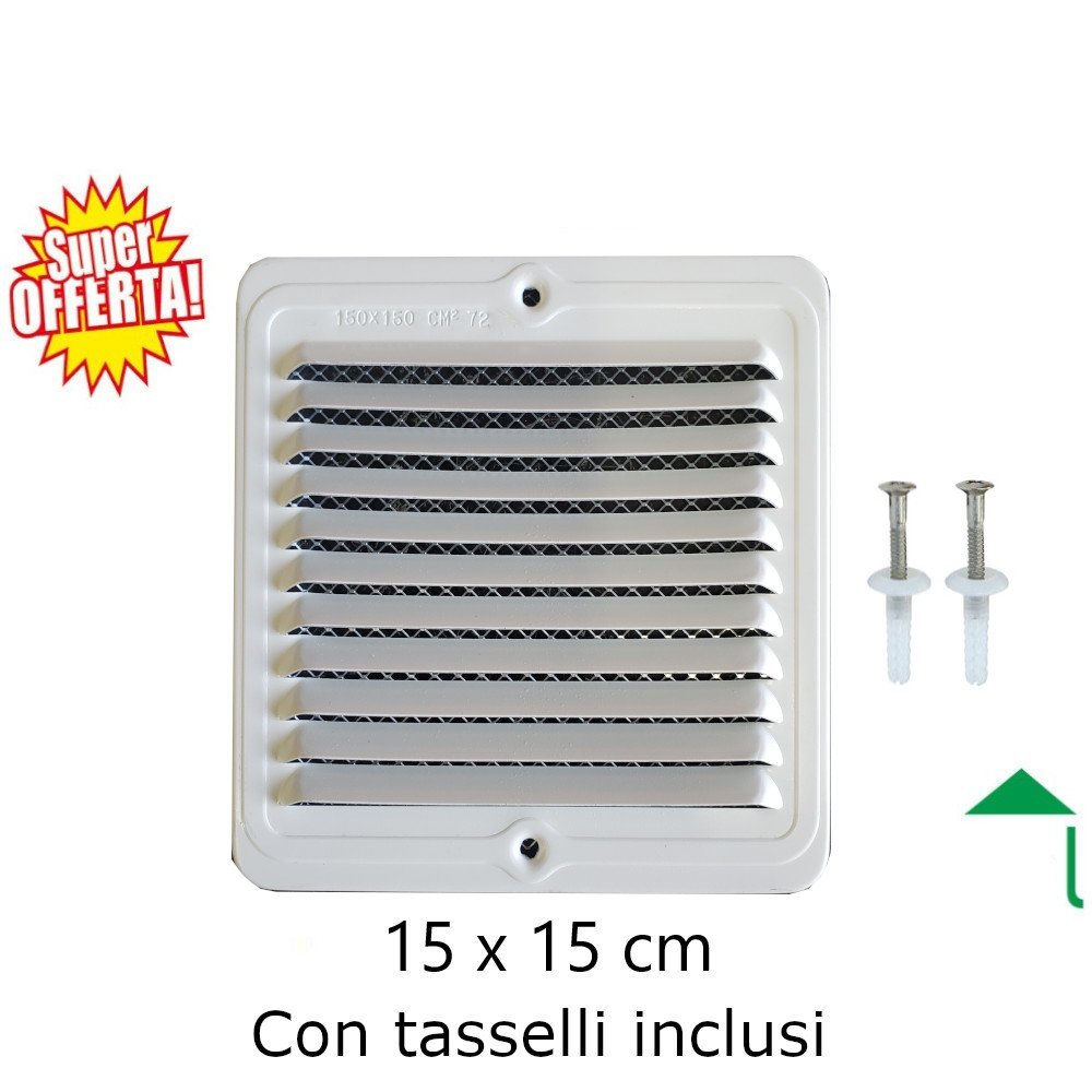Griglia aerazione alluminio Bianco 15 x 15. Chiamata anche griglia di aerazione cucina quadrata 15 x 15 cm con spessore da 5 mm per aerazione locali, cucine, bagni e tutti gli spazi che hanno bisogno di un ricambio d’aria efficace. Questa non è una semplice griglia ventilazione, perché essendo in alluminio non è soggetta agli agenti atmosferici e non arrugginisce facendo in modo che la spesa per una griglia in alluminio risulti una spesa migliore e definitiva nel tempo.
