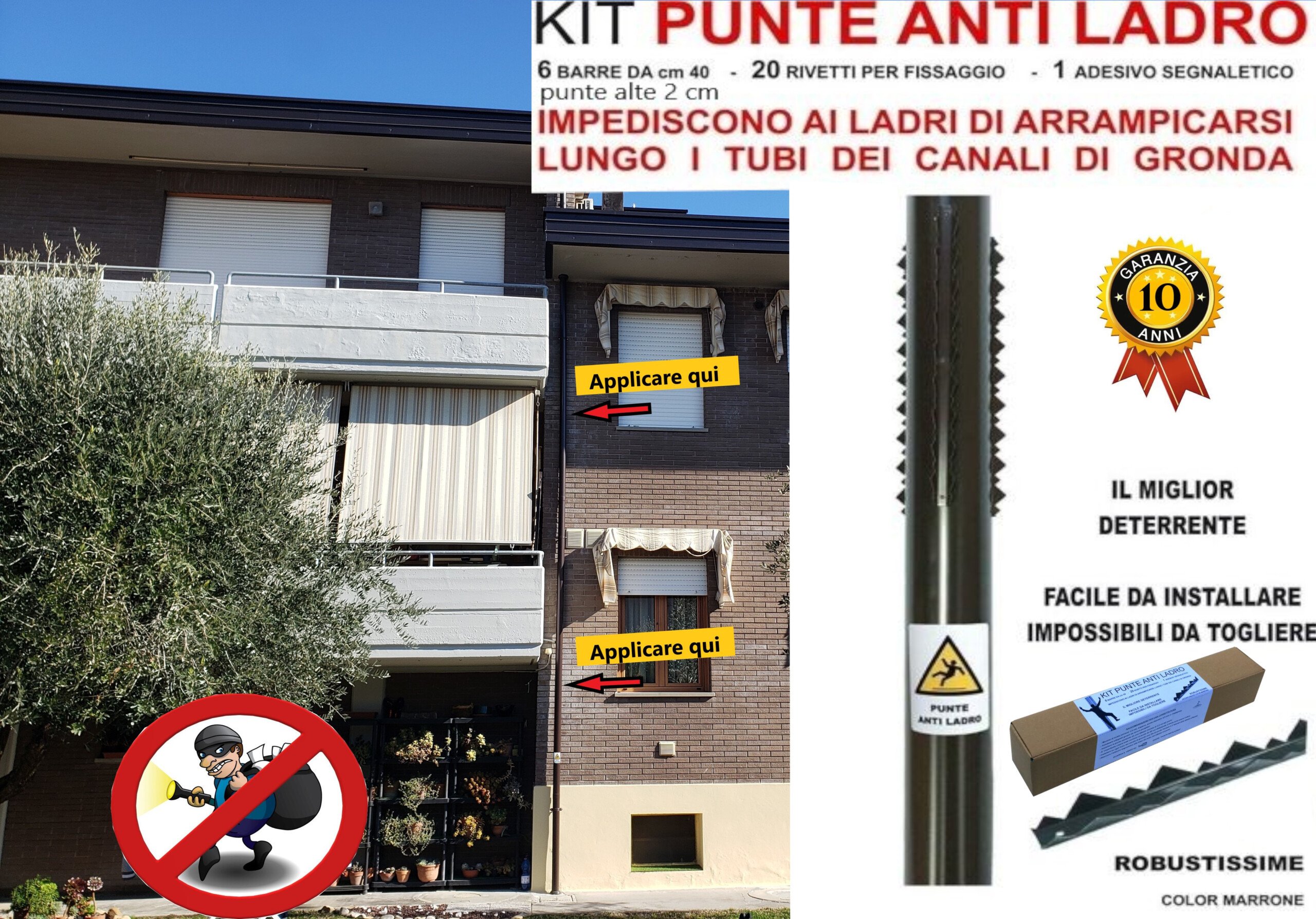 Il montaggio: (1) posizionare le punte ad un altezza almeno di MT 2,00 (2) fare con una matita i segni dove forare con rivetti, (3) bucare il pluviale ed inserire i rivetti con una rivettatrice. In alternativa incollare le barre con un biadesivo oppure con silicone o colla a caldo., (4) Infine apporre l’adesivo di pericolo punte.