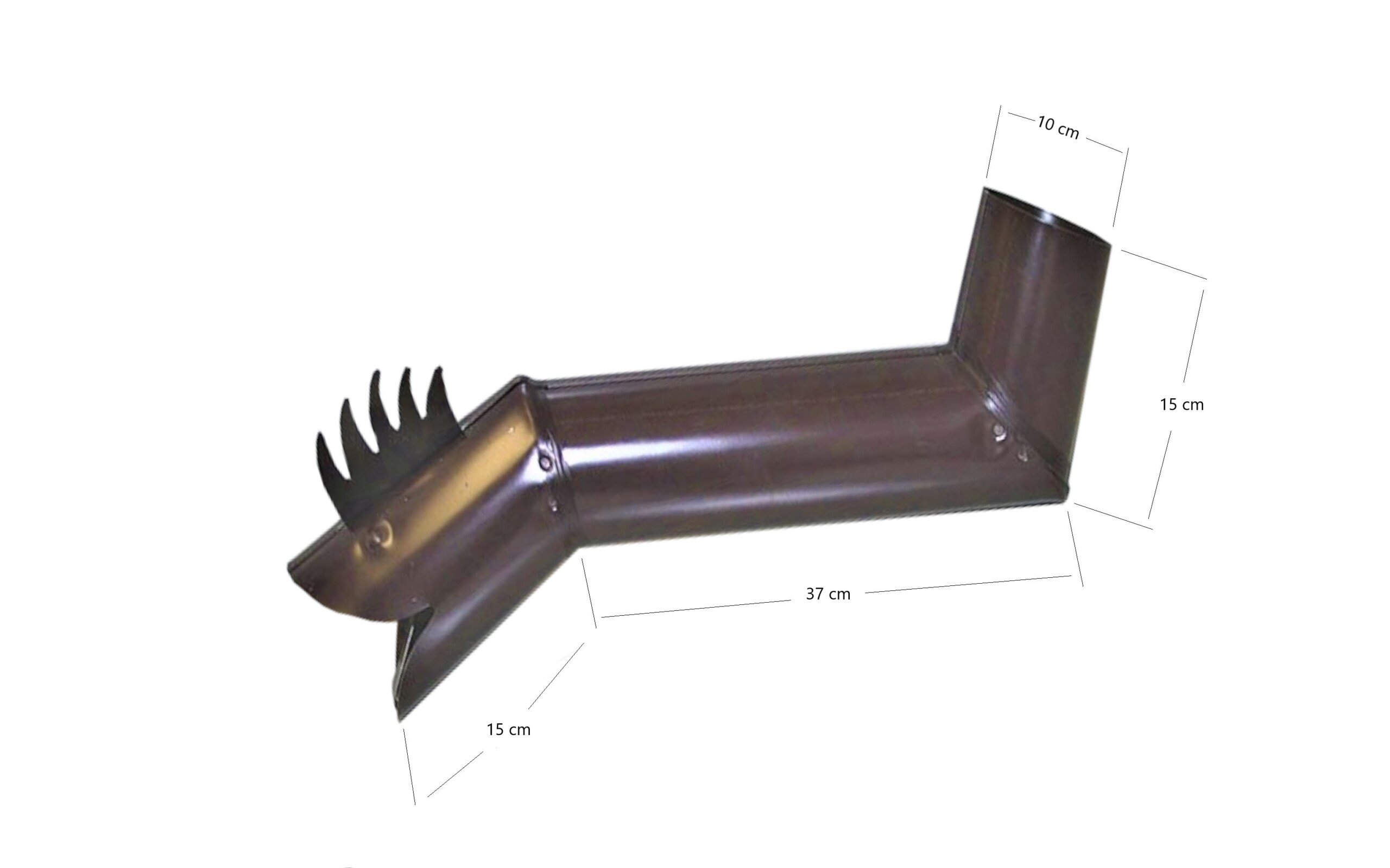 Scarico grondaia serpente lamiera testa di moro da 100 mm. Chiamato anche gocciolatoio o buttavia a forma di serpente, è adatto per grondaia e pluviale da aggiungere come decorazione a piccole coperture o lavori di bricolage, per abbellire con un tocco di classe grondaie, portici, gazebo, ingressi o piccole tettoie. Può essere usato anche come gocciolatoio balcone o come scarico per grondaia con catena. Completamente realizzato a mano, riesce a direzionare la caduta dell’acqua spostandola ed allontanandola fino al punto più consono alle nostre esigenze. Estremamente apprezzato anche per il nobile materiale rimane una bellissima alternativa per migliorare la nostra abitazione con un tocco di artigianalità. Bellissimo anche abbinato con catene sia alla grondaia in alluminio che in lamiera. Facile e veloce da installare, basta posizionarlo nello scarico della grondaia e girarlo dove si vuole indirizzare l’acqua piovana, fissandolo con rivetti o silicone.